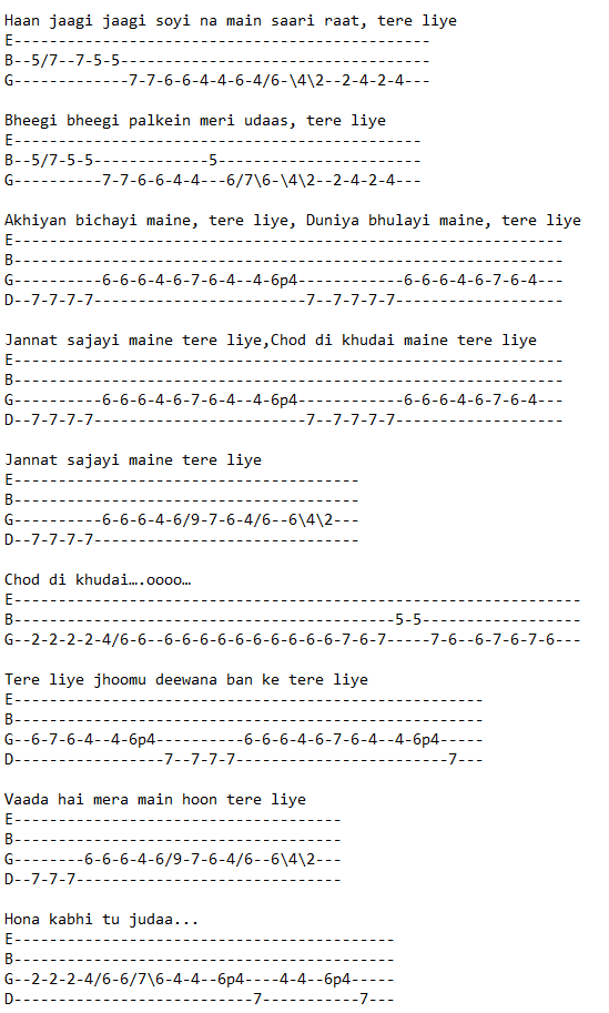 by: chordsPosted on: November 16, 2025Tere Liye Guitar Tabs – Atif Aslam Post Views: 199 How useful was this post? Click on a star to rate it! Submit Rating Average rating 4.7 / 5. Vote count: 7 No votes so far! Be the first to rate this post.